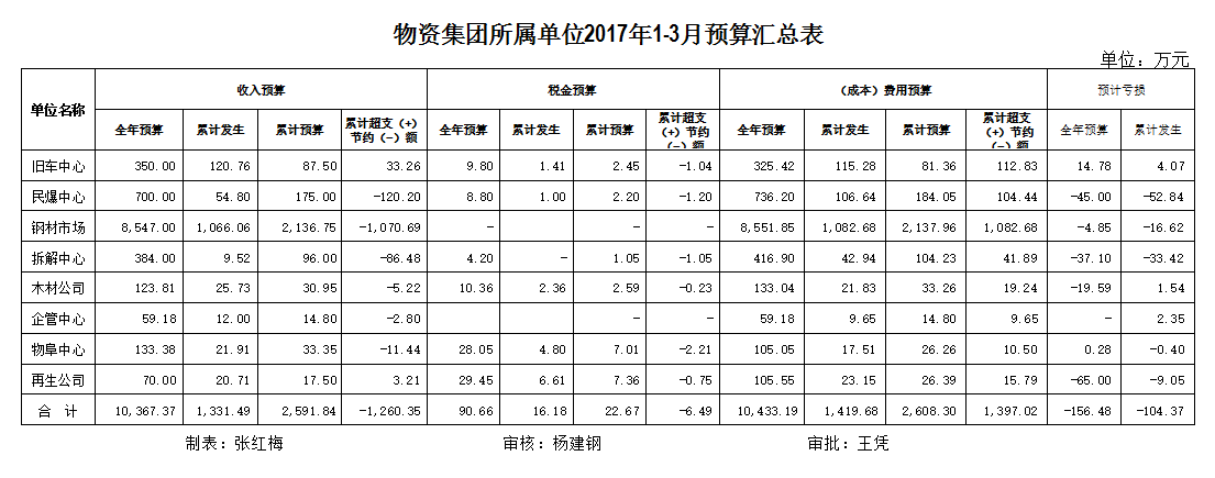 物資集團所屬單位2017年1-3月預算匯總表
