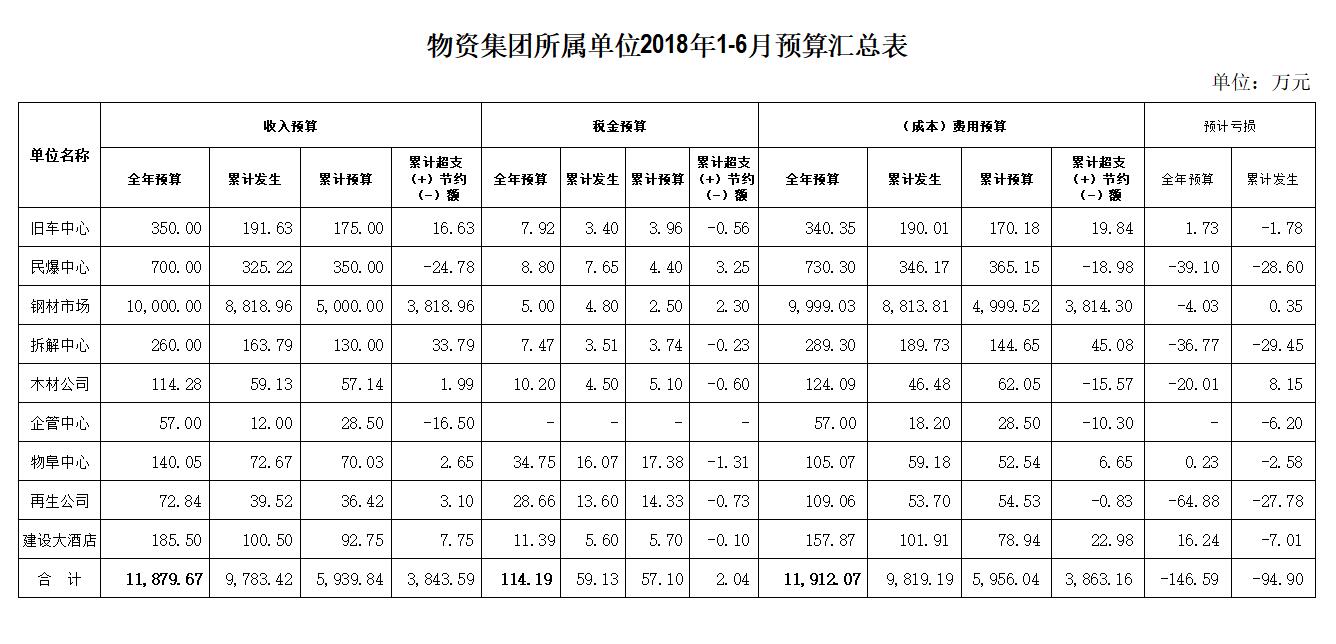 物資集團(tuán)所屬單位2018年1-6月預(yù)算匯總表