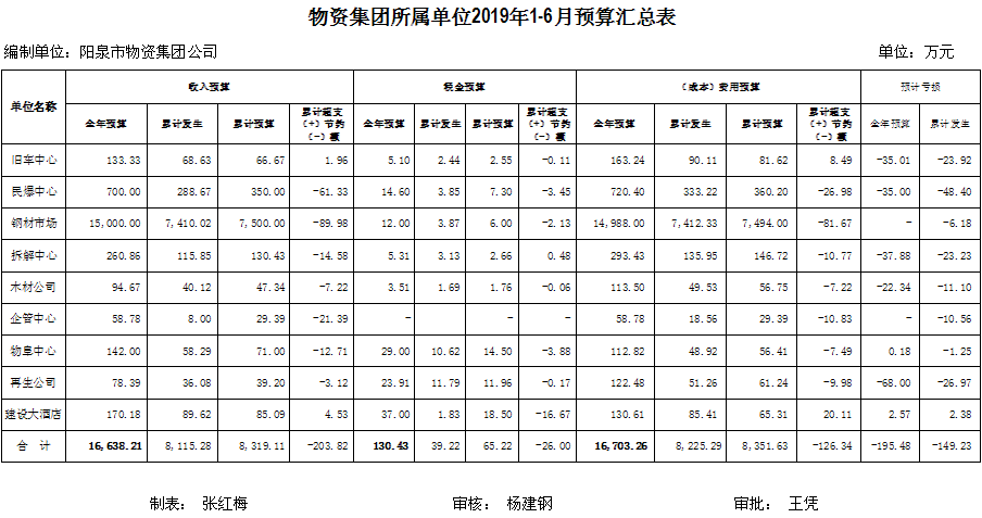 物資集團(tuán)所屬單位2019年1-6月預(yù)算匯總表