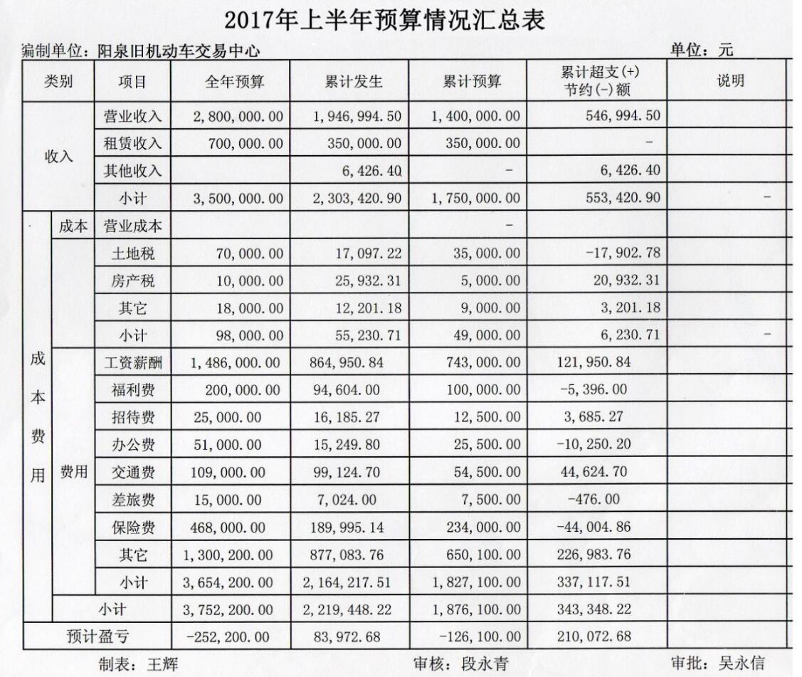 2017年1-6月舊車中心預(yù)算收入175萬元,實際收入230余萬元,超額完成預(yù)算目標(biāo),上半年交通費超支預(yù)算較多,為嚴(yán)格控制交通費用支出,企業(yè)削減了公車使用量,下半年中心將對企業(yè)閑置車輛進(jìn)行處置,以保證國有資產(chǎn)的保值增值。2017年上半年企業(yè)預(yù)算執(zhí)行情況匯總?cè)缦拢?/p>
