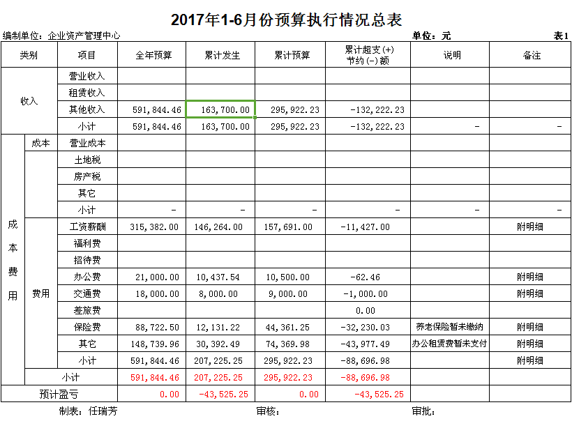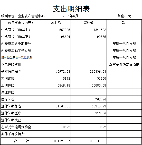 陽(yáng)泉市物資集團(tuán)公司企業(yè)資產(chǎn)管理中心隸屬于陽(yáng)泉市物資集團(tuán)公司,是經(jīng)市國(guó)資委批準(zhǔn)成立的物資集團(tuán)公司七家歇業(yè)關(guān)閉企業(yè)留守機(jī)構(gòu),主要負(fù)責(zé)處理七家歇業(yè)關(guān)閉企業(yè)的相關(guān)事宜,資產(chǎn)管理中心工作人員編制7人。截止目前,我中心共涉及管理原企業(yè)各類人員675人,資金來源主要依靠財(cái)政撥款,支出主要分為內(nèi)養(yǎng)人員經(jīng)常性費(fèi)用和中心留守人員及機(jī)構(gòu)運(yùn)行費(fèi)用兩部分。2017年財(cái)政核準(zhǔn)收入預(yù)算789.9萬(wàn)元:其中內(nèi)養(yǎng)人員經(jīng)常性費(fèi)用743.3萬(wàn)元,中心留守人員及機(jī)構(gòu)運(yùn)行費(fèi)用46.6萬(wàn)元?,F(xiàn)將上半年預(yù)算執(zhí)行情況及財(cái)務(wù)報(bào)表公示如下: