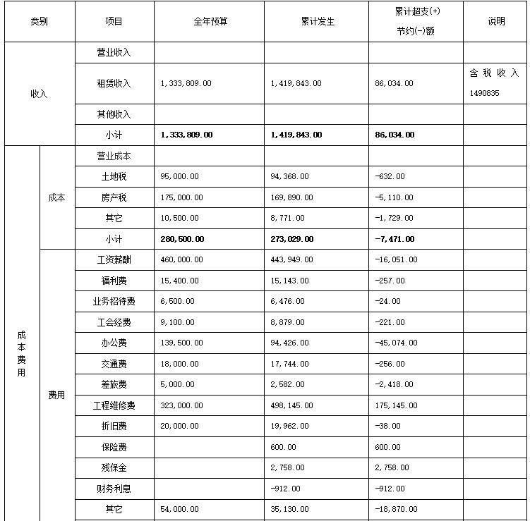 2017年中心以為黨的十九大勝利召開(kāi)創(chuàng)造穩(wěn)定的安全生產(chǎn)環(huán)境為首要目標(biāo),以安全、效益為中心,穩(wěn)步發(fā)展,善集成器。全年租賃收入預(yù)算140萬(wàn)元,實(shí)際完成149萬(wàn)元,完成年計(jì)劃106.43%,上繳稅金34.4萬(wàn)元,各項(xiàng)費(fèi)用均控制在預(yù)算范圍內(nèi),同時(shí)實(shí)現(xiàn)了安全無(wú)事故。