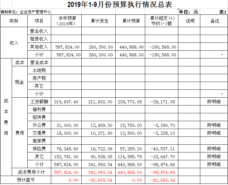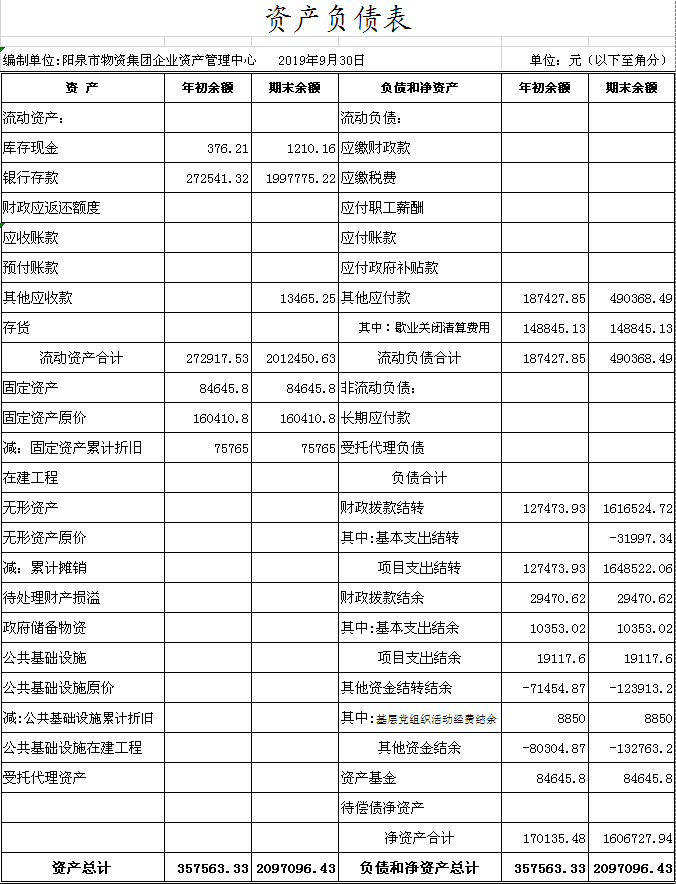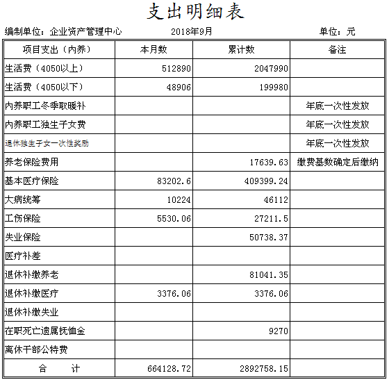 陽泉市物資集團(tuán)公司企業(yè)資產(chǎn)管理中心成立于2014年11月,是物資集團(tuán)公司原化輕總公司等七家歇業(yè)關(guān)閉企業(yè)的留守機(jī)構(gòu),隸屬于陽泉市物資集團(tuán)公司。截止9月份底,企業(yè)總?cè)藬?shù)663人,其中在冊職工346人,離退休職工317人。在冊職工按照年齡結(jié)構(gòu)劃分“40、50”以下人員127人,“40、50”以上人員219人。在冊職工生活和社保等費(fèi)用享受財政補(bǔ)貼。1-9月份發(fā)放內(nèi)養(yǎng)人員生活費(fèi)225萬元,繳納醫(yī)療保險54萬元,為8名到齡退休人員辦理了退休手續(xù)?,F(xiàn)將三季度財務(wù)狀況及支出情況公示如下: