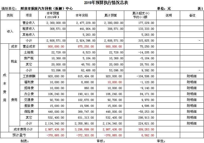 1-12月份,經(jīng)營收入 248 萬元,其他收入 44 萬元,收入合計(jì) 292 萬元,完成年度預(yù)算 260 萬元的 112.3% ;利潤 -37 萬元,完成年度利潤 -37 萬元的 100% ;發(fā)生成本費(fèi)用 329 萬元,完成預(yù)算 299萬元的110.0%;在崗人員工資按照不低于2019年陽泉市最低標(biāo)準(zhǔn)按時(shí)發(fā)放。