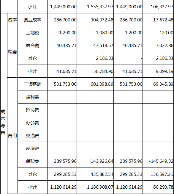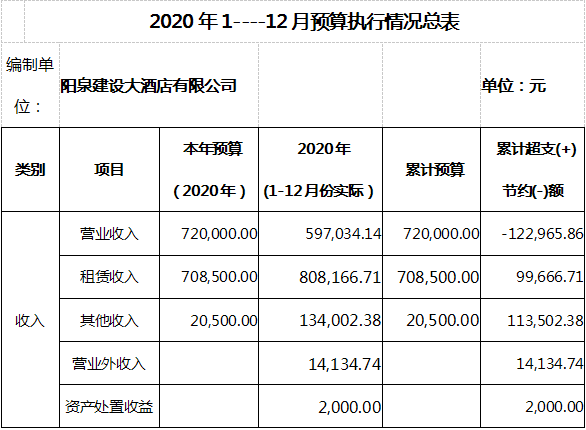 2020年酒店營業(yè)收入:153.92萬元,營業(yè)成本:30.44萬元,稅金及附加:5.08萬元,銷售費用:70.76萬元,管理費用:47.27萬元,財務(wù)費用:0.06萬元,資產(chǎn)處置收益:0.2萬元,營業(yè)利潤:0.51萬元。全年職工工資按時發(fā)放,醫(yī)療保險足額上繳,失業(yè)保險從2020年7月開始全額繳納,養(yǎng)老保險交至2018年6月底。