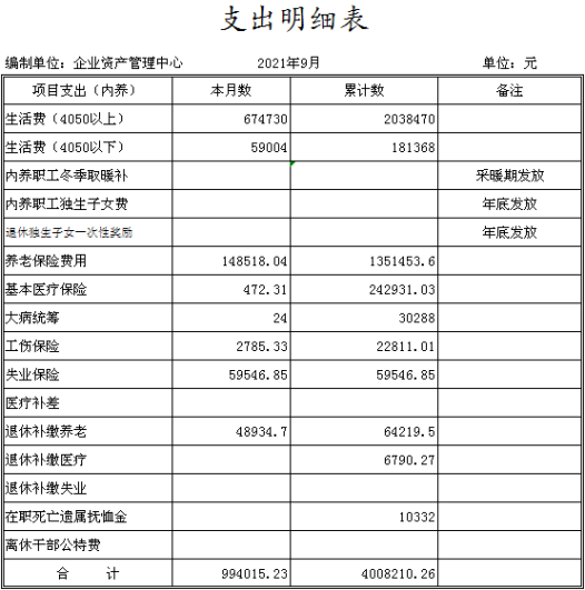 陽泉市物資集團公司企業(yè)資產(chǎn)管理中心成立于2014年11月,是物資集團公司原化輕總公司等七家歇業(yè)關閉企業(yè)的留守機構,隸屬于陽泉市物資集團公司。截止9月份底,企業(yè)總?cè)藬?shù)649人,其中在冊職工298人,離退休職工351人。在冊職工按照年齡結構劃分“40、50”以下人員103人,“40、50”以上人員195人。在冊職工生活和社保等費用享受財政補貼。1-9月份發(fā)放內(nèi)養(yǎng)人員生活費222萬元,繳納養(yǎng)老保險141萬元,繳納醫(yī)療保險28萬元,為9名到齡退休人員辦理了退休手續(xù)?,F(xiàn)將上半年財務狀況及支出情況公示如下: