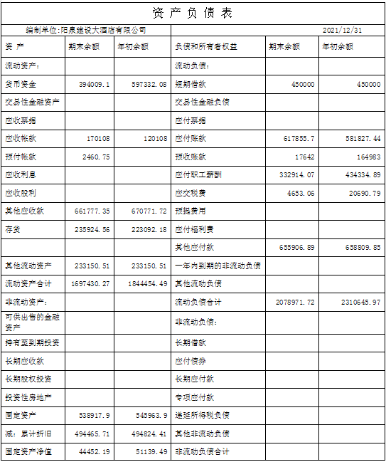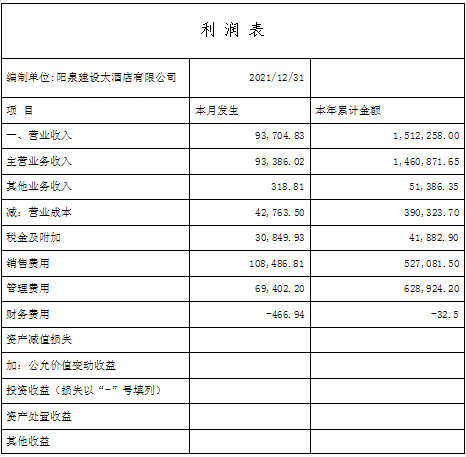 2021年酒店?duì)I業(yè)收入為151.23萬元;營(yíng)業(yè)成本為39.03萬元;稅金及附加為4.19萬元;銷售費(fèi)用為52.71萬元;管理費(fèi)用為62.89萬元;營(yíng)業(yè)利潤(rùn)為-7.59萬元;營(yíng)業(yè)外收入為11.10萬元;營(yíng)業(yè)外支出0.83萬元;利潤(rùn)總額為2.68萬元;所得稅費(fèi)用為0.27萬元;凈利潤(rùn)為2.41萬元。