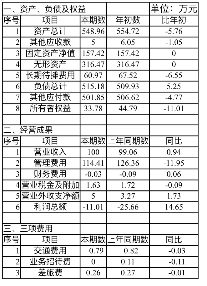 1、三季度營業(yè)收入100萬元,比上年同期99.06萬元增加0.94萬元;管理費(fèi)用114.41萬元,比去年同期126.36萬元減少11.95萬元。