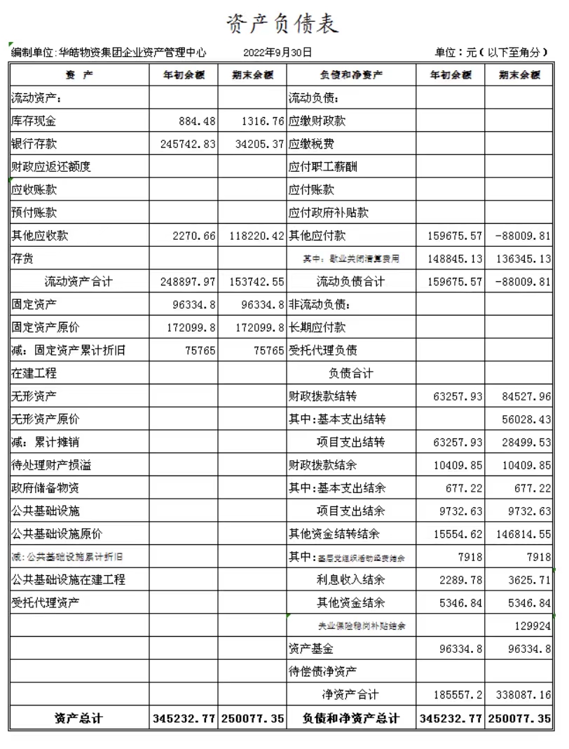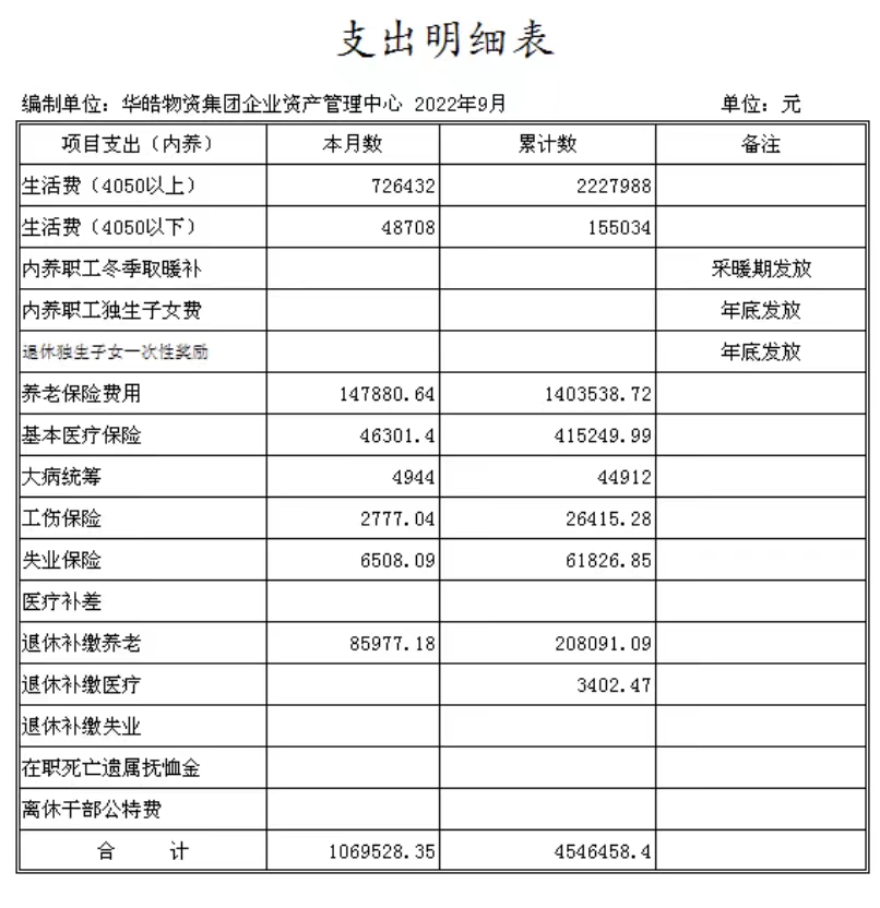 陽泉市華皓物資集團(tuán)有限責(zé)任公司企業(yè)資產(chǎn)管理中心成立于2014年11月,是華皓物資集團(tuán)公司原化輕總公司等七家歇業(yè)關(guān)閉企業(yè)的留守機(jī)構(gòu),隸屬于陽泉市華皓物資集團(tuán)有限責(zé)任公司。截止9月份底,企業(yè)總?cè)藬?shù)649人,其中在冊職工280人,離退休職工369人。在冊職工按照年齡結(jié)構(gòu)劃分“40、50”以下人員86人,“40、50”以上人員149人。在冊職工生活和社保等費(fèi)用享受財(cái)政補(bǔ)貼。1-9月份發(fā)放內(nèi)養(yǎng)人員生活費(fèi)238萬元,繳納養(yǎng)老保險(xiǎn)161萬元,繳納醫(yī)療保險(xiǎn)46萬元,為19名到齡退休人員辦理了退休手續(xù)?,F(xiàn)將三季度財(cái)務(wù)狀況及支出情況公示如下: